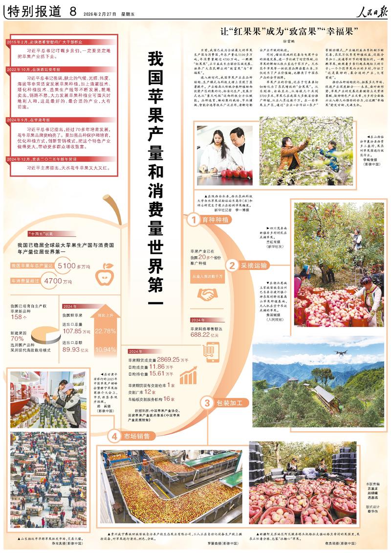 本报北京2月26日电(记者常钦、李晓晴)中国人的“果盘子”里,苹果占据着举足轻重的地位。中国苹果产业协会联合国家苹果产业技术体系发布的《中国苹果产业发展报告》显示,“十四五”以来,我国已稳居全球最大苹果生产国与消费国。苹果期货成为全球首个鲜果期货品种,我国在国际定价体系中的话语权显著提升。这颗“国民果”迈入高质量发展的新阶段。