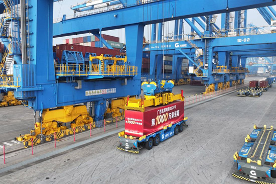 广西北部湾港第1000万标箱起吊。广西北部湾港集团供图