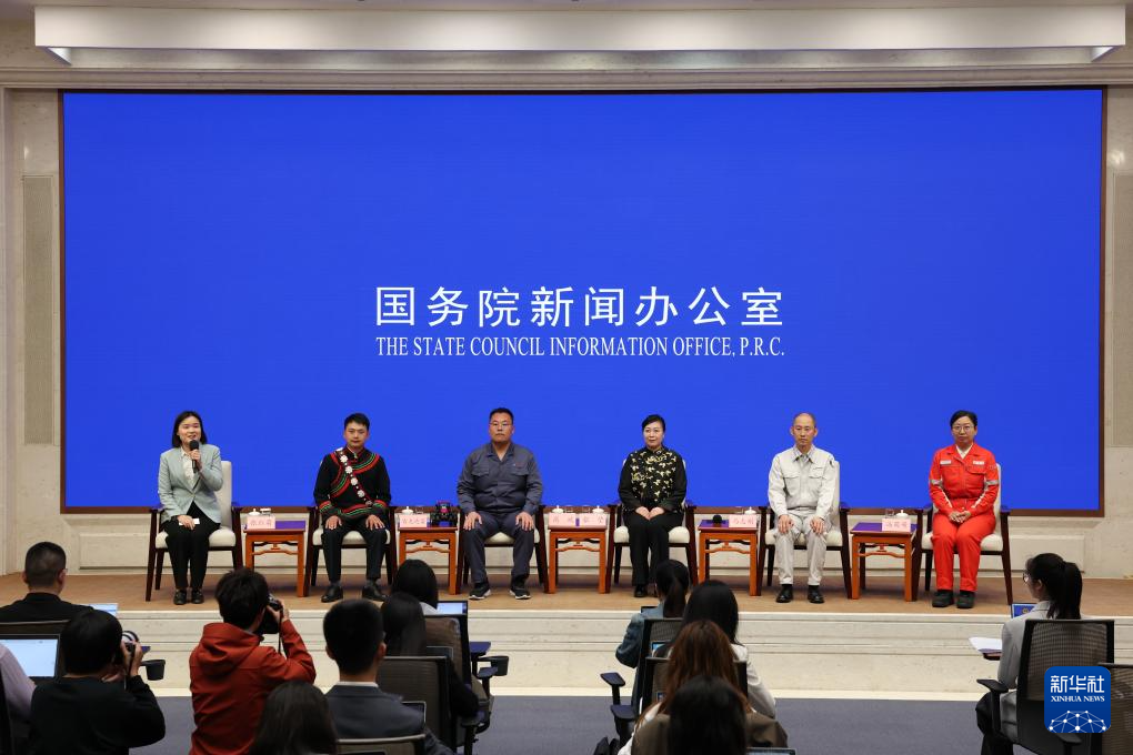 4月29日,国务院新闻办公室在北京举行“新征程上的奋斗者”中外记者见面会,产业工人代表围绕“劳动创造幸福 实干成就伟业”与中外记者见面交流。新华社记者 唐如峰 摄