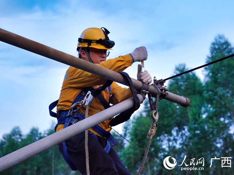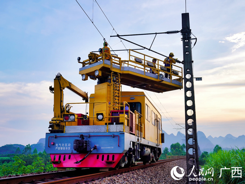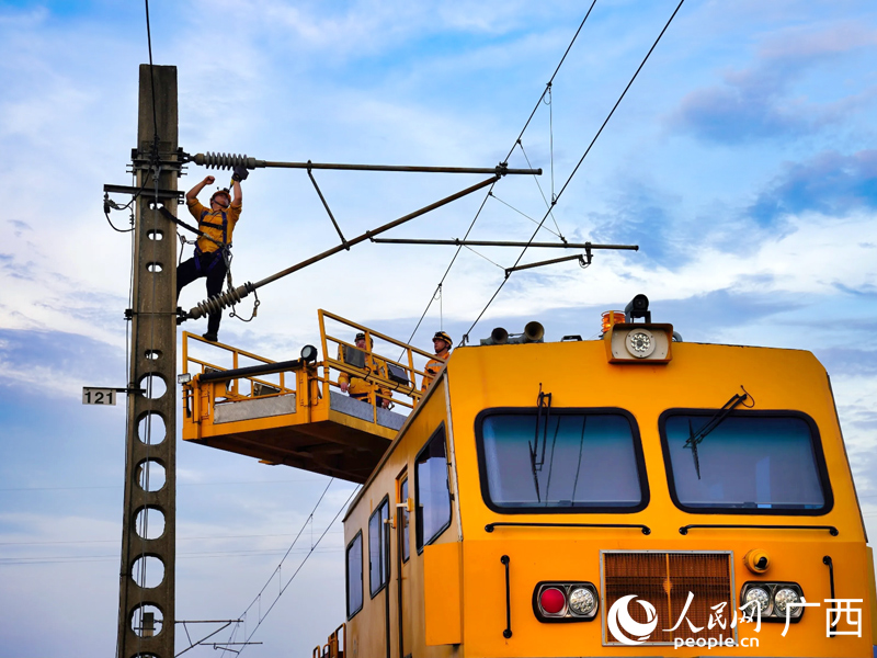 人民网柳州9月3日电 傍晚,天空像是被打翻的调色盘,从深邃的蓝渐变为柔和的橙红,几缕残云如丝缕般飘浮,被夕阳染成了绚丽的色彩。在黔桂铁路叶茂站至怀远站区段,一群身着黄色工作服的铁路供电职工正站在距地面5米多高的作业平台上紧张作业。