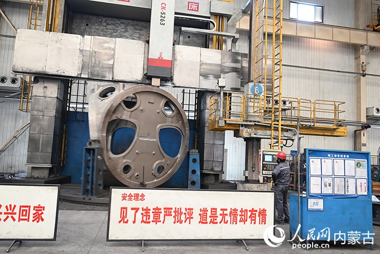 在内蒙古龙马重工集团有限公司加工车间,近3米高、20余吨的风电轮毂在机床设备上飞速旋转,进行打磨;在一旁,工人进入到轮毂内部,进行人工打磨;另一边,工人正在提示板上记录着各个机床上设备的安全生产时间。