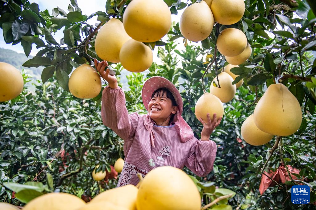 10月15日,云南省文山壮族苗族自治州西畴县鸡街乡村民采摘柚子。