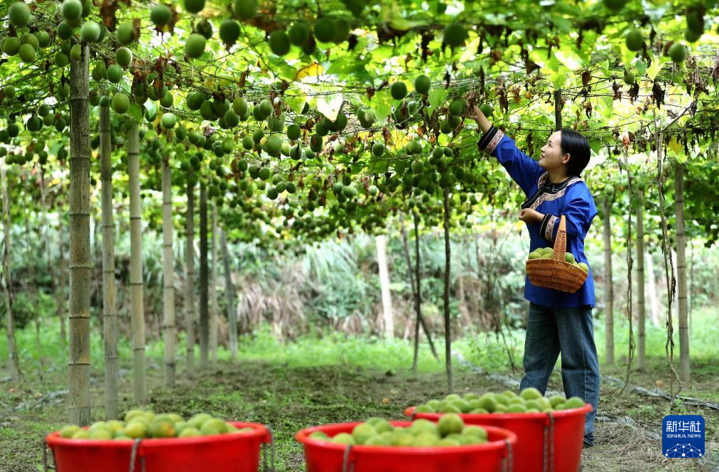 10月14日,村民在贵州省黔东南苗族侗族自治州榕江县忠诚镇俾堵村罗汉果种植基地采摘罗汉果。
