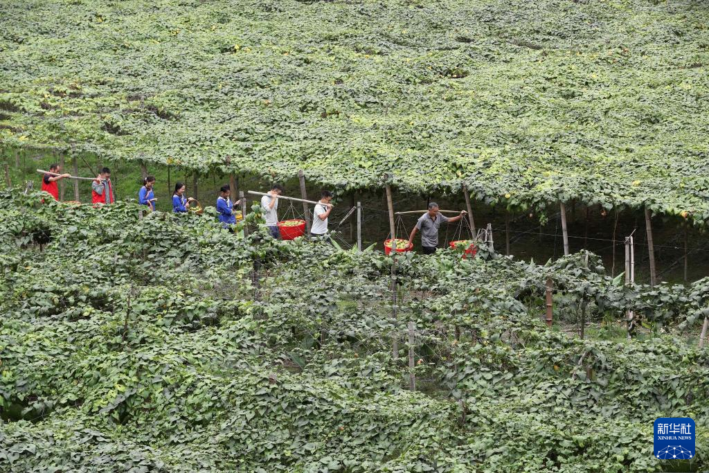 10月14日,村民在贵州省黔东南苗族侗族自治州榕江县忠诚镇俾堵村罗汉果种植基地挑运罗汉果。