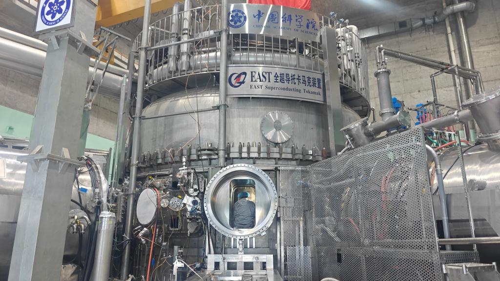 新华社合肥11月5日电 题:“夸父”逐日!“人造太阳”向未来 新华社记者陈诺、戴威 记者在安徽合肥科学岛见到“人造太阳”时,恰逢夕阳给这个官方名称为全超导托卡马克核聚变实验装置(EAST)披上金色外衣。装置舱门大开,身着白衣、头戴蓝帽的工程师们进进出出,头顶龙门吊升降腾挪,脚下切割机嗡嗡作响。这幅火热场景,正是中国聚变事业数年如一日执着追梦的缩影。 EAST升级改造现场。(新华社记者陈诺 摄) 万物生长靠太阳,能否在地球上造一个“太阳”,模拟其聚变反应,实现人类的能源之变?科学家想到编织一个“磁笼子”容纳高温、高压的聚变反应。这个装置运行的时间是关键。聚变研究之初,我国老一辈科学家用生活物资换回国外装置,在简陋实验室里手搓线圈、改造升级,运行时间仅以毫秒计。2006年,中国自主建成EAST装置,当年实现3秒运行。 “十四五”时期,EAST先后实现稳态高约束模式等离子体运行101秒、403秒等世界纪录。今年1月20日下午,EAST创造“亿度千秒”世界纪录,这意味着装置以超过1亿摄氏度的高温稳定运行了1000秒,在实验装置上首次模拟出未来聚变堆运行所需的环境。 经过十余万次实验、一代代“夸父”的接力,中国聚变研究实现了从“跟跑”到“并跑”再到部分“领跑”的历史性跨越。 EAST正在进行新一轮升级。“明年2月前,它将完成加热系统和水冷系统的改造,继续服务于新一代核聚变装置的预研工作。”中国科学院合肥物质科学研究院副院长、等离子体物理研究所所长宋云涛说,“在提高原始创新能力上持续用力,在突破关键核心技术、前沿技术上抓紧攻关,这个‘太阳’正年轻。” 循着“逐日”的足迹,记者一路向北,来到又一个大科学装置——聚变堆主机关键系统综合研究设施“夸父”园区,这里一场体系化攻坚正酣。 八分之一真空室。(新华社记者陈诺 摄) 2018年12月获批开工建设以来,围绕下一代“人造太阳”核心部件的研制,“夸父”园区将核心任务拆解成19个子系统,进行体系化攻关。目前总体工程进度已超过92%。 今年,“夸父”园区十余个流线型的厂房内,好消息接连不断:6月低杂波电流驱动系统通过专家组测试与验收;9月国产离子回旋加热系统研制成功;10月世界最大环向场磁体线圈盒交付…… “夸父”园区11号厂房巨型的穹顶下,一个硕大的“橘子瓣”——八分之一真空室静卧中央。未来,八个“橘子瓣”将精准拼接,构成下一代“人造太阳”的核心舱室。“从预研、研制、调试到正式建成并通过验收,我们历时十年攻关,形成40余项发明专利。”八分之一真空室及总体安装系统负责人刘志宏自豪地说,最近几个月,“橘子瓣”旁愈加热闹,偏滤器原型件给它装上超强“盾牌”,遥操作系统测试平台的机械臂徐徐展开,如夸父伸出巨臂,精准探入装置内部进行检测。 “夸父”园区中央,一座夸父雕像立于一座金属山峰之上,他身体前倾,前后伸出双臂,仿佛飞翔。远处塔吊林立处,紧凑型聚变能实验装置(BEST)主机大厅已经封顶。就在今年国庆节当天,其首个关键部件实现“毫米级落座”,正式进入主机组装阶段。 “夸父”园区的夸父雕像。(新华社记者陈诺 摄) “十五五”时期将是中国聚变能源发展的关键阶段,从实验堆到示范堆,从科学验证到工程实现。“从EAST模拟实验,到‘夸父’造部件,再到BEST演示发电,我们正稳步迈向聚变能商用发电。”宋云涛给出了时间表:BEST装置争取2027年底建成,之后开展燃烧等离子体物理实验,点亮第一盏灯。 聚变之光,悄然照进寻常百姓家。在医疗领域,超导质子治疗系统凭借聚变衍生技术精准打击肿瘤;在合肥的地铁站,太赫兹安检仪正守护人流——这项源自“人造太阳”监测技术的产品,已走进不少公共场所。“未来太赫兹还将用于脑机接口、生物医药。”安徽中科太赫兹科技有限公司总经理王宏北说,“我们将全力以赴参与推动核聚变能成为新的经济增长点。” 《中共中央关于制定国民经济和社会发展第十五个五年规划的建议》提出推动科技创新和产业创新深度融合。围绕整个聚变能产业,合肥持续打造产业集群,涵盖上游超导线材生产、中游主机设备制造、下游设计运营商等全产业链,覆盖超导材料、磁体系统、真空设备等产业链环节。 暮色渐深,EAST控制大厅亮起灯火。大屏幕上“亿度千秒”的纪录下方,是那行科研人员最熟悉的提示:Waiting for next shot。这个见证了16万次放电、屡破世界纪录的大厅,记录着每一次向着太阳的冲刺,也正在静静等待下一个迈向科技自立自强的关键突破。