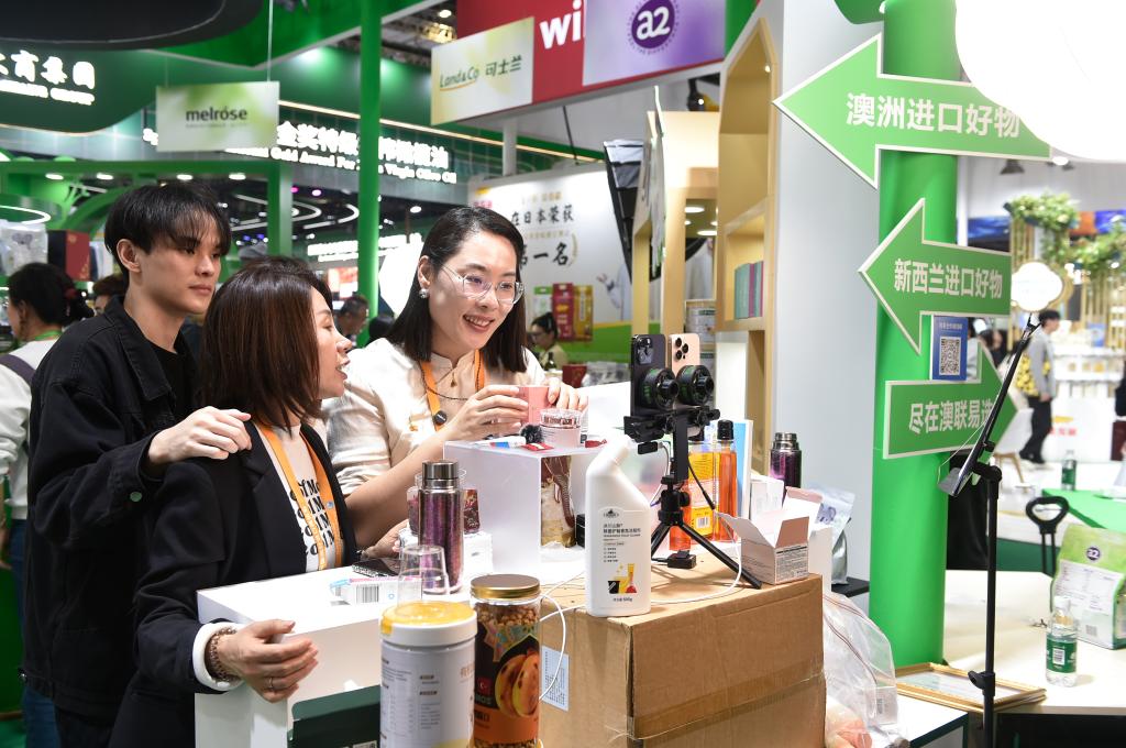 11月9日,工作人员在第八届进博会农食产品展区现场进行直播销售。新华社记者鲁鹏摄