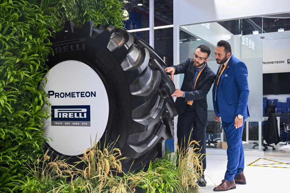 11月6日,在第八届进博会汽车及智慧出行展区百得安轮胎集团展台,展商在亚洲首发产品绿色农业轮胎AT02前交流。新华社记者陈浩明摄