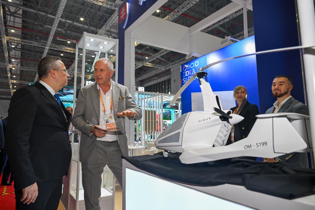 11月5日,在第八届进博会国家展斯洛伐克馆,参展商(左二)在向嘉宾(左一)介绍一款飞机产品。新华社记者陈浩明摄