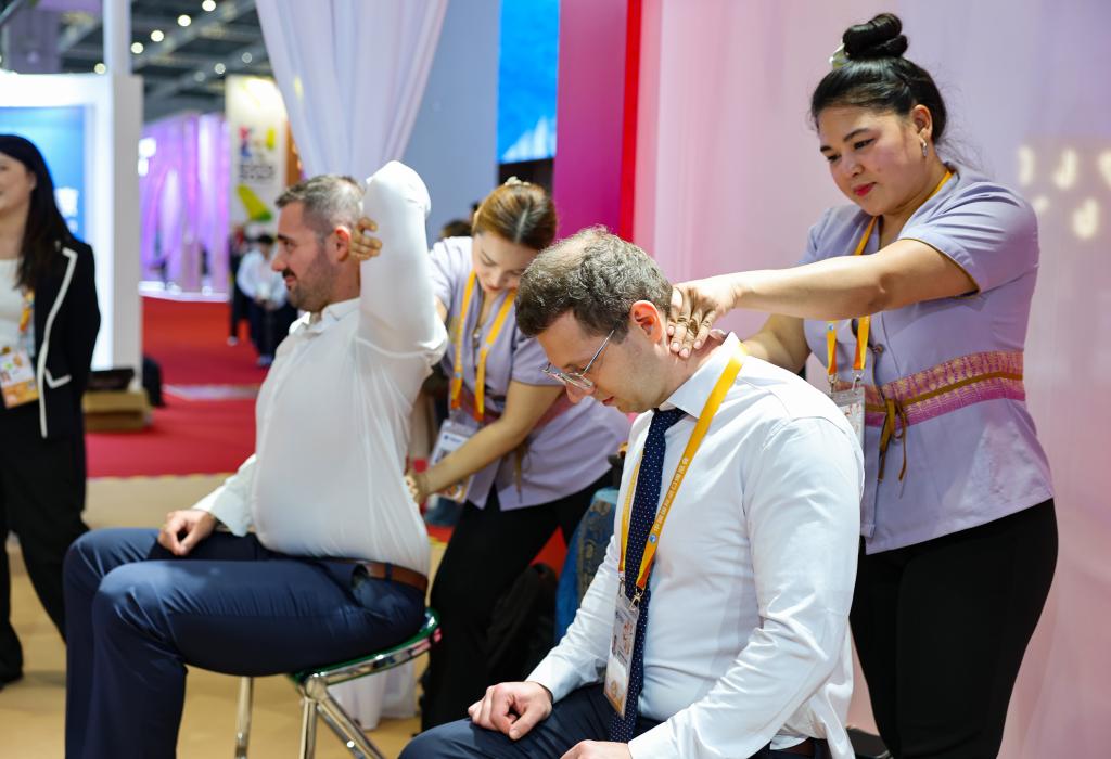 11月5日,人们在第八届进博会国家展泰国馆体验泰式按摩。新华社记者王泽聪摄