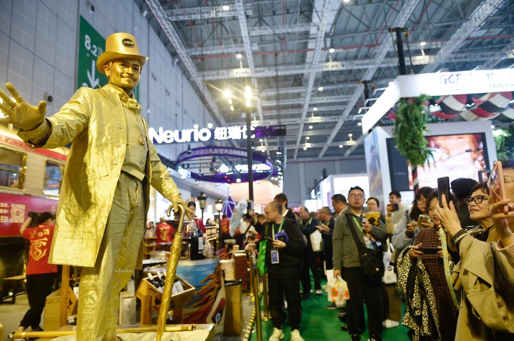 11月9日,演员在第八届进博会农食产品展区与观众互动。新华社记者鲁鹏摄
