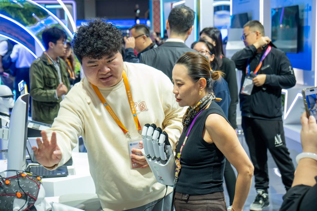 11月5日,观众在第八届进博会国家展中国馆了解非侵入式脑机接口机器人。新华社记者丁赫摄