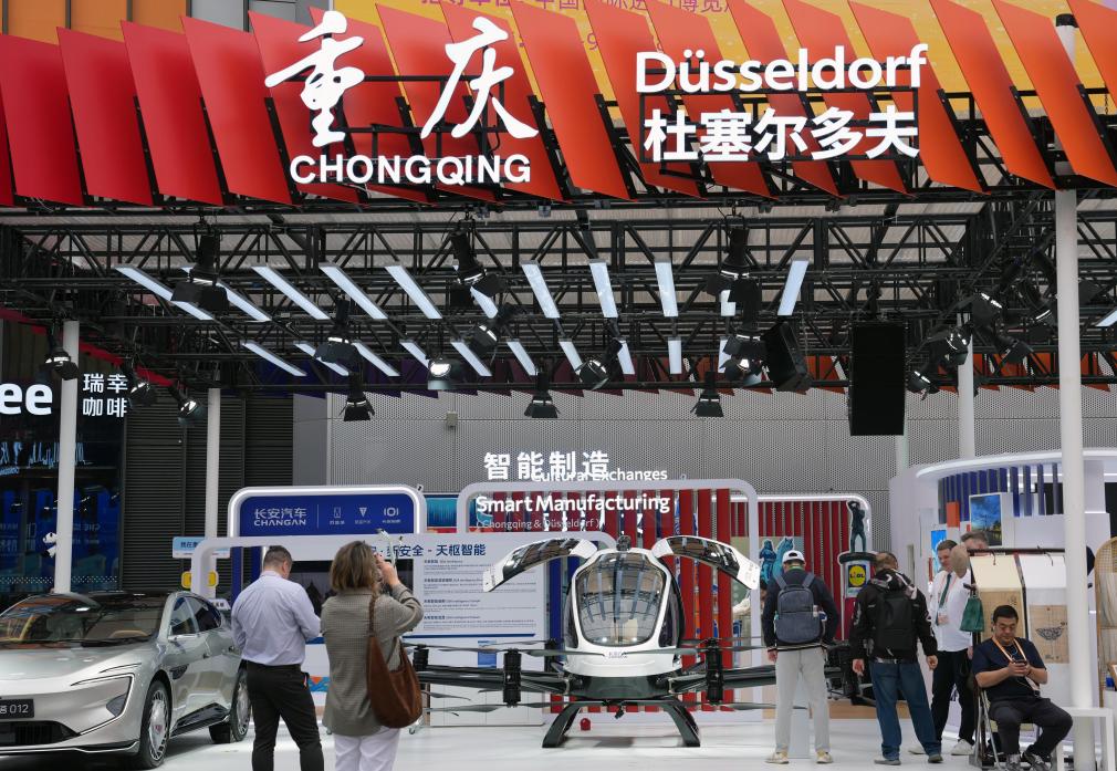 这是中国重庆与德国杜塞尔多夫在第八届进博会上共同举办的双城联展现场,展出内容涵盖文化、经贸等领域合作成果(11月8日摄)。新华社记者刘颖摄