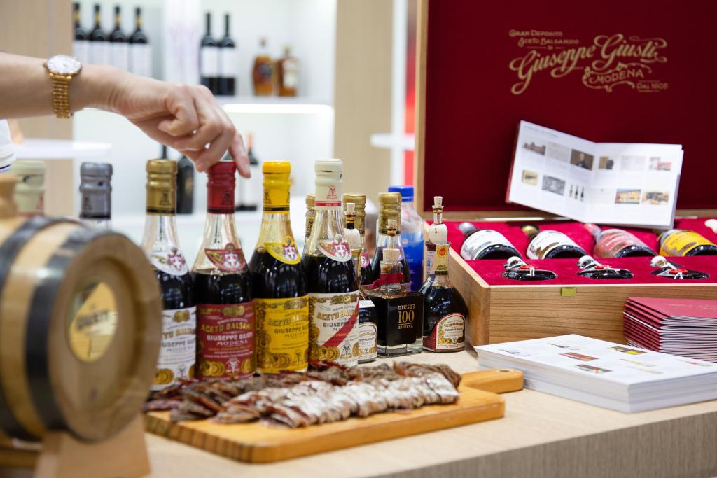 这是11月7日在第八届进博会农食产品展区一处展台内拍摄的意大利黑醋。新华社记者田薇薇摄