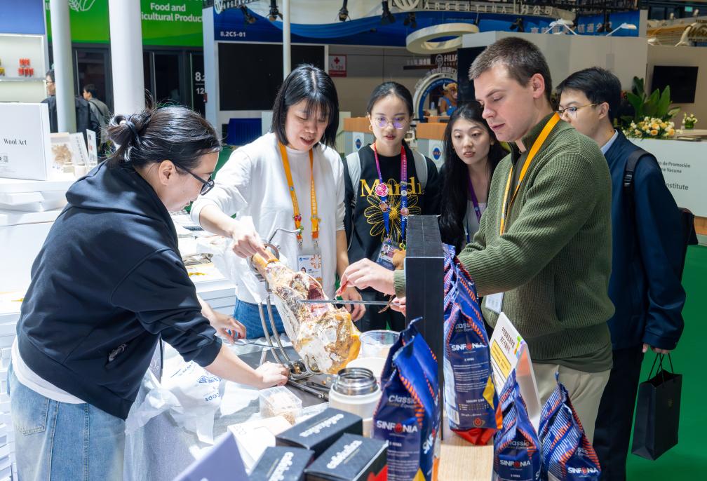 11月5日,在第八届进博会农食产品展区,参展商为观众介绍伊比利亚火腿。新华社记者周荻潇摄
