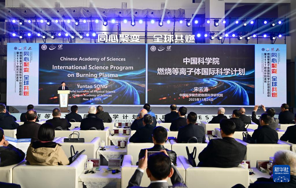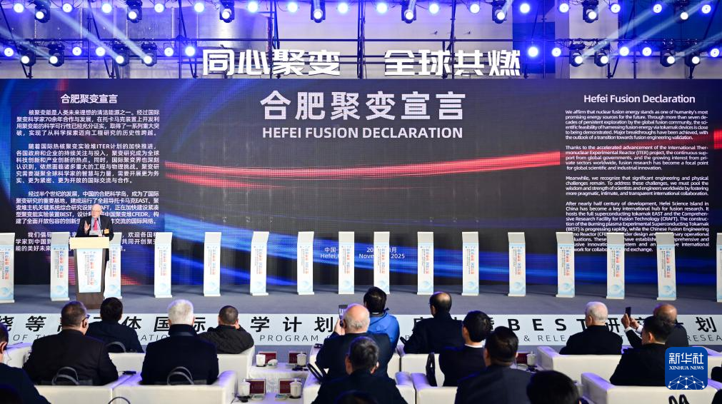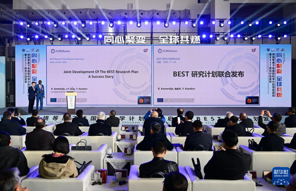 这是11月24日拍摄的紧凑型聚变能实验装置(BEST)建设现场(无人机照片)。 11月24日,在位于安徽合肥未来大科学城的紧凑型聚变能实验装置(BEST)主机大厅,中国科学院“燃烧等离子体”国际科学计划正式启动并面向国际聚变界首次发布BEST研究计划,聚力点燃“人造太阳”。 根据国际科学计划,中国科学院合肥物质科学研究院等离子体物理研究所将面向全球开放包括BEST在内的多个核聚变大科学装置平台,设立开放科研基金、资助高频次专家互访交流。来自法国、英国、德国等十余个国家的聚变科学家共同签署《合肥聚变宣言》,该宣言倡导开放共享与合作共赢精神,鼓励各国的科研人员到中国开展聚变合作研究。 新华社记者 周牧 摄 这是11月24日拍摄的紧凑型聚变能实验装置(BEST)建设现场(无人机照片)。 11月24日,在位于安徽合肥未来大科学城的紧凑型聚变能实验装置(BEST)主机大厅,中国科学院“燃烧等离子体”国际科学计划正式启动并面向国际聚变界首次发布BEST研究计划,聚力点燃“人造太阳”。 根据国际科学计划,中国科学院合肥物质科学研究院等离子体物理研究所将面向全球开放包括BEST在内的多个核聚变大科学装置平台,设立开放科研基金、资助高频次专家互访交流。来自法国、英国、德国等十余个国家的聚变科学家共同签署《合肥聚变宣言》,该宣言倡导开放共享与合作共赢精神,鼓励各国的科研人员到中国开展聚变合作研究。 新华社记者 周牧 摄 这是11月24日拍摄的紧凑型聚变能实验装置(BEST)建设现场(无人机照片)。 11月24日,在位于安徽合肥未来大科学城的紧凑型聚变能实验装置(BEST)主机大厅,中国科学院“燃烧等离子体”国际科学计划正式启动并面向国际聚变界首次发布BEST研究计划,聚力点燃“人造太阳”。 根据国际科学计划,中国科学院合肥物质科学研究院等离子体物理研究所将面向全球开放包括BEST在内的多个核聚变大科学装置平台,设立开放科研基金、资助高频次专家互访交流。来自法国、英国、德国等十余个国家的聚变科学家共同签署《合肥聚变宣言》,该宣言倡导开放共享与合作共赢精神,鼓励各国的科研人员到中国开展聚变合作研究。 新华社记者 周牧 摄 这是11月24日拍摄的紧凑型聚变能实验装置(BEST)建设现场(无人机照片)。 11月24日,在位于安徽合肥未来大科学城的紧凑型聚变能实验装置(BEST)主机大厅,中国科学院“燃烧等离子体”国际科学计划正式启动并面向国际聚变界首次发布BEST研究计划,聚力点燃“人造太阳”。 根据国际科学计划,中国科学院合肥物质科学研究院等离子体物理研究所将面向全球开放包括BEST在内的多个核聚变大科学装置平台,设立开放科研基金、资助高频次专家互访交流。来自法国、英国、德国等十余个国家的聚变科学家共同签署《合肥聚变宣言》,该宣言倡导开放共享与合作共赢精神,鼓励各国的科研人员到中国开展聚变合作研究。 新华社记者 周牧 摄 11月24日,BEST研究计划首次面向国际聚变界发布。 11月24日,在位于安徽合肥未来大科学城的紧凑型聚变能实验装置(BEST)主机大厅,中国科学院“燃烧等离子体”国际科学计划正式启动并面向国际聚变界首次发布BEST研究计划,聚力点燃“人造太阳”。 根据国际科学计划,中国科学院合肥物质科学研究院等离子体物理研究所将面向全球开放包括BEST在内的多个核聚变大科学装置平台,设立开放科研基金、资助高频次专家互访交流。来自法国、英国、德国等十余个国家的聚变科学家共同签署《合肥聚变宣言》,该宣言倡导开放共享与合作共赢精神,鼓励各国的科研人员到中国开展聚变合作研究。 新华社记者 周牧 摄 11月24日,中国科学院合肥物质科学研究院副院长、等离子体物理研究所所长宋云涛在活动现场作报告。 11月24日,在位于安徽合肥未来大科学城的紧凑型聚变能实验装置(BEST)主机大厅,中国科学院“燃烧等离子体”国际科学计划正式启动并面向国际聚变界首次发布BEST研究计划,聚力点燃“人造太阳”。 根据国际科学计划,中国科学院合肥物质科学研究院等离子体物理研究所将面向全球开放包括BEST在内的多个核聚变大科学装置平台,设立开放科研基金、资助高频次专家互访交流。来自法国、英国、德国等十余个国家的聚变科学家共同签署《合肥聚变宣言》,该宣言倡导开放共享与合作共赢精神,鼓励各国的科研人员到中国开展聚变合作研究。 新华社记者 周牧 摄 11月24日,来自十余个国家的聚变科学家共同签署《合肥聚变宣言》。 11月24日,在位于安徽合肥未来大科学城的紧凑型聚变能实验装置(BEST)主机大厅,中国科学院“燃烧等离子体”国际科学计划正式启动并面向国际聚变界首次发布BEST研究计划,聚力点燃“人造太阳”。 根据国际科学计划,中国科学院合肥物质科学研究院等离子体物理研究所将面向全球开放包括BEST在内的多个核聚变大科学装置平台,设立开放科研基金、资助高频次专家互访交流。来自法国、英国、德国等十余个国家的聚变科学家共同签署《合肥聚变宣言》,该宣言倡导开放共享与合作共赢精神,鼓励各国的科研人员到中国开展聚变合作研究。 新华社记者 周牧 摄 11月24日,英国科学家艾伦·科斯特利宣读《合肥聚变宣言》。 11月24日,在位于安徽合肥未来大科学城的紧凑型聚变能实验装置(BEST)主机大厅,中国