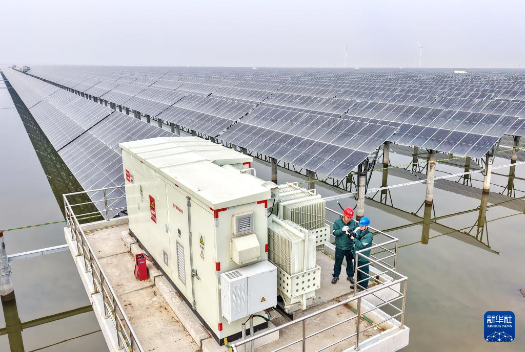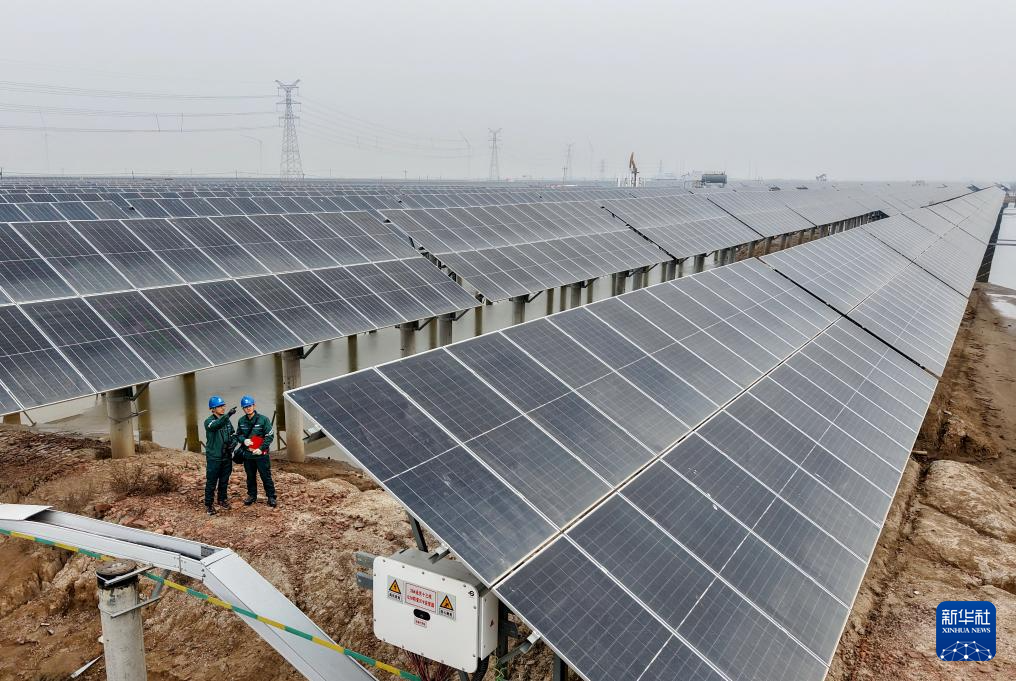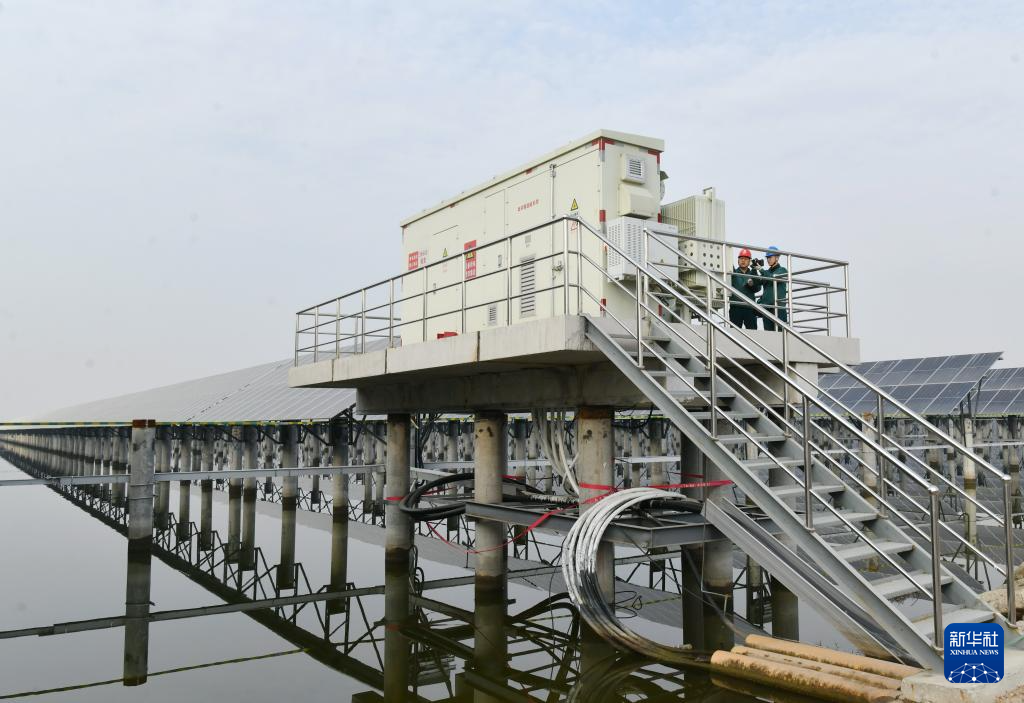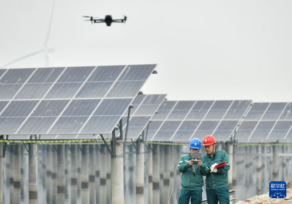 12月10日拍摄的河北省沧州市渤海新区黄骅市一处风电场和“渔光互补”光伏发电场(无人机照片)。 近年来,河北省沧州市依托沿海滩涂、水产品养殖场、盐场等资源,有序发展“渔光互补”光伏发电、风力发电等新能源项目,助力经济绿色低碳发展。据国网沧州供电公司介绍,目前该市风电、光伏发电等清洁能源装机容量达到1010.7万千瓦,占统调总装机容量的62.14%。 新华社记者 杨世尧 摄 12月10日,国网沧州供电公司的工人在辖区渤海新区黄骅市一处“渔光互补”光伏发电场巡检。 近年来,河北省沧州市依托沿海滩涂、水产品养殖场、盐场等资源,有序发展“渔光互补”光伏发电、风力发电等新能源项目,助力经济绿色低碳发展。据国网沧州供电公司介绍,目前该市风电、光伏发电等清洁能源装机容量达到1010.7万千瓦,占统调总装机容量的62.14%。 新华社记者 杨世尧 摄 12月10日,国网沧州供电公司的工人在辖区渤海新区黄骅市一处“渔光互补”光伏发电场巡检(无人机照片)。 近年来,河北省沧州市依托沿海滩涂、水产品养殖场、盐场等资源,有序发展“渔光互补”光伏发电、风力发电等新能源项目,助力经济绿色低碳发展。据国网沧州供电公司介绍,目前该市风电、光伏发电等清洁能源装机容量达到1010.7万千瓦,占统调总装机容量的62.14%。 新华社记者 杨世尧 摄 12月10日,国网沧州供电公司的工人在辖区渤海新区黄骅市一处“渔光互补”光伏发电场巡检(无人机照片)。 近年来,河北省沧州市依托沿海滩涂、水产品养殖场、盐场等资源,有序发展“渔光互补”光伏发电、风力发电等新能源项目,助力经济绿色低碳发展。据国网沧州供电公司介绍,目前该市风电、光伏发电等清洁能源装机容量达到1010.7万千瓦,占统调总装机容量的62.14%。 新华社记者 杨世尧 摄 12月10日,国网沧州供电公司的工人在辖区渤海新区黄骅市一处“渔光互补”光伏发电场使用无人机巡检。 近年来,河北省沧州市依托沿海滩涂、水产品养殖场、盐场等资源,有序发展“渔光互补”光伏发电、风力发电等新能源项目,助力经济绿色低碳发展。据国网沧州供电公司介绍,目前该市风电、光伏发电等清洁能源装机容量达到1010.7万千瓦,占统调总装机容量的62.14%。 新华社记者 杨世尧 摄