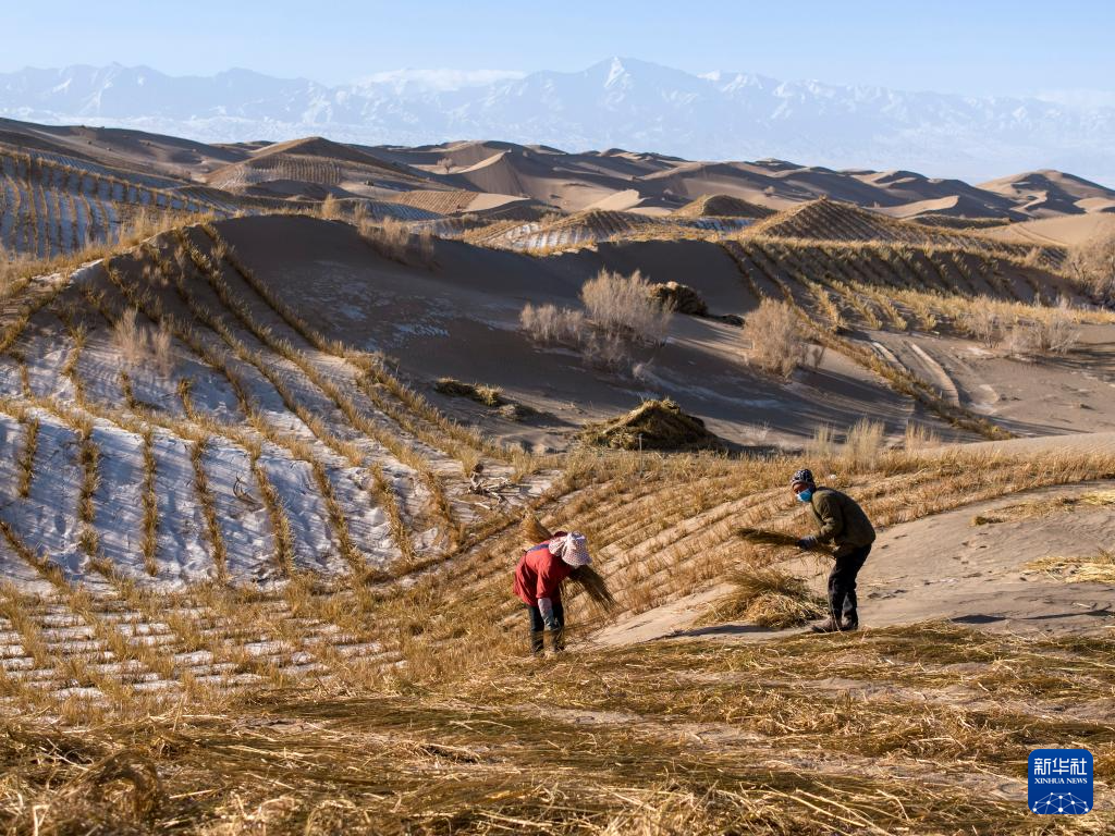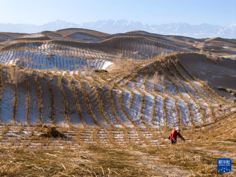 12月13日,施工人员在库姆塔格沙漠铺设沙障(无人机照片)。 一场冬雪过后,在甘肃省酒泉市阿克塞哈萨克族自治县的库姆塔格沙漠边缘,施工人员忙着铺设沙障,有序推进甘肃省酒泉市祁连山北麓阿克塞片区水源涵养与生态保护修复项目。该项目总规模22.2万亩,包括工程固沙、封滩(沙)育林、人工造灌木林等防沙治沙项目。 新华社发(高宏善摄) 12月13日,施工人员在库姆塔格沙漠铺设沙障。 一场冬雪过后,在甘肃省酒泉市阿克塞哈萨克族自治县的库姆塔格沙漠边缘,施工人员忙着铺设沙障,有序推进甘肃省酒泉市祁连山北麓阿克塞片区水源涵养与生态保护修复项目。该项目总规模22.2万亩,包括工程固沙、封滩(沙)育林、人工造灌木林等防沙治沙项目。 新华社发(高宏善摄) 12月13日,施工人员在库姆塔格沙漠驾车运送铺设沙障的物资。 一场冬雪过后,在甘肃省酒泉市阿克塞哈萨克族自治县的库姆塔格沙漠边缘,施工人员忙着铺设沙障,有序推进甘肃省酒泉市祁连山北麓阿克塞片区水源涵养与生态保护修复项目。该项目总规模22.2万亩,包括工程固沙、封滩(沙)育林、人工造灌木林等防沙治沙项目。 新华社发(高宏善摄) 12月13日,施工人员在库姆塔格沙漠铺设沙障(无人机照片)。 一场冬雪过后,在甘肃省酒泉市阿克塞哈萨克族自治县的库姆塔格沙漠边缘,施工人员忙着铺设沙障,有序推进甘肃省酒泉市祁连山北麓阿克塞片区水源涵养与生态保护修复项目。该项目总规模22.2万亩,包括工程固沙、封滩(沙)育林、人工造灌木林等防沙治沙项目。 新华社发(高宏善摄)