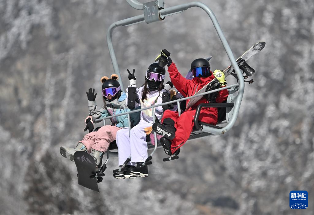 1月6日,在阿坝藏族羌族自治州汶川县羌人谷滑雪场,滑雪爱好者乘坐吊椅前往雪道顶。