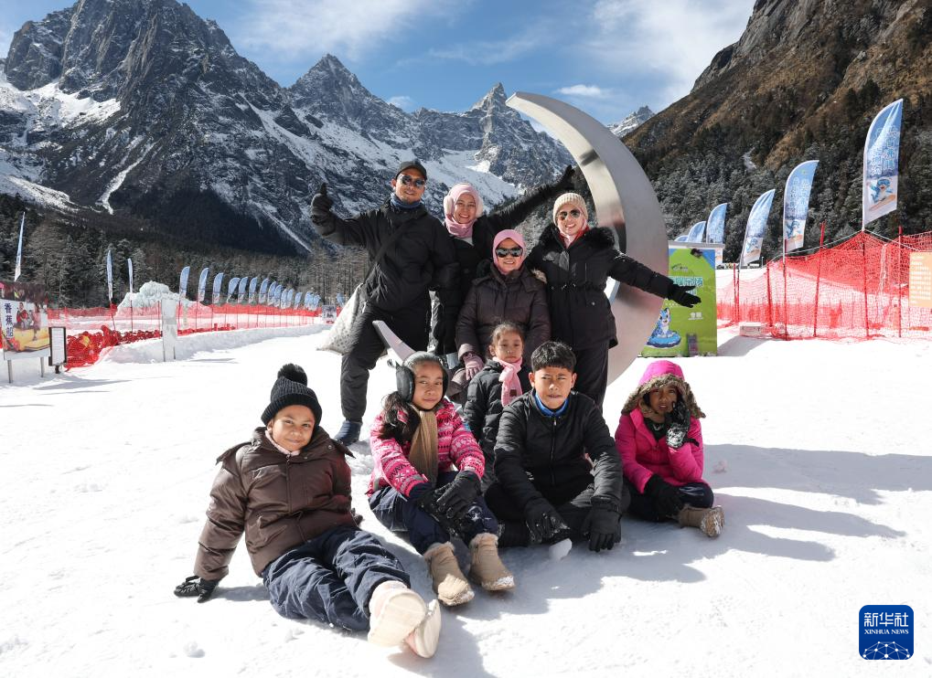 1月5日,一群来自马来西亚的游客在四川省理县毕棚沟滑雪场游玩。