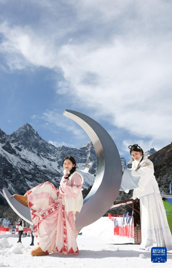 1月5日,两位游客在四川省理县毕棚沟滑雪场拍照。