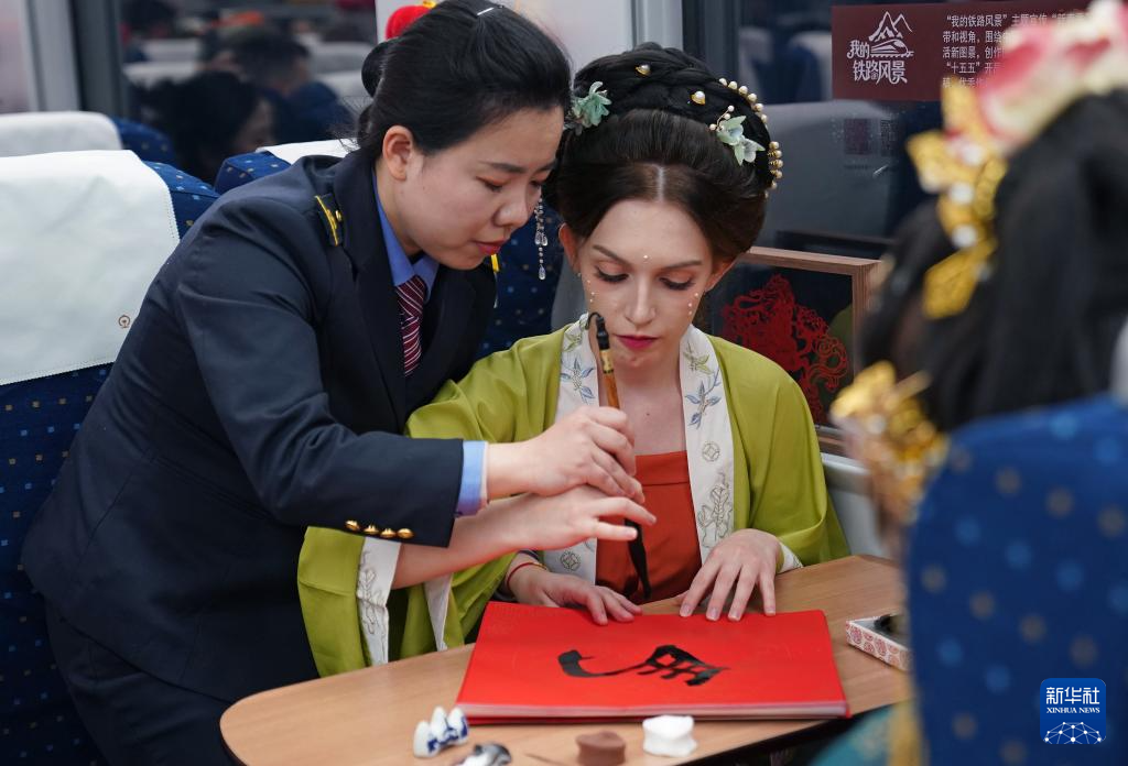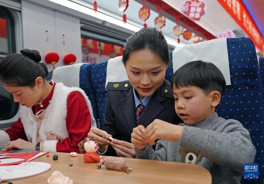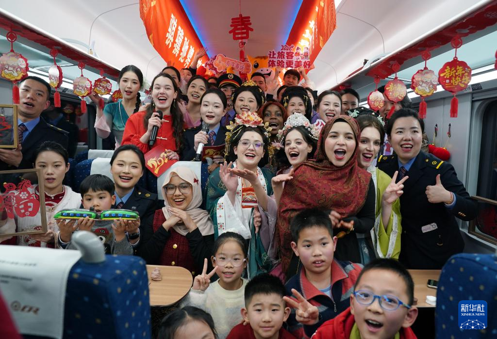 2月10日,参加演出的外国留学生与小旅客在列车内招手。 春节来临之际,一场特殊的“春晚”在南昌至北京丰台的D138次列车上举行。列车工作人员与外国留学生通过汉服展示、歌舞表演、书法互动等活动,让旅客在这个流动的大家庭里,感受各国文化的魅力与暖意融融的中国年味。 新华社记者 万象 摄 2月10日,列车工作人员在列车“春晚”现场为旅客表演。 春节来临之际,一场特殊的“春晚”在南昌至北京丰台的D138次列车上举行。列车工作人员与外国留学生通过汉服展示、歌舞表演、书法互动等活动,让旅客在这个流动的大家庭里,感受各国文化的魅力与暖意融融的中国年味。 新华社记者 万象 摄 2月10日,列车工作人员教俄罗斯留学生书写汉字。 春节来临之际,一场特殊的“春晚”在南昌至北京丰台的D138次列车上举行。列车工作人员与外国留学生通过汉服展示、歌舞表演、书法互动等活动,让旅客在这个流动的大家庭里,感受各国文化的魅力与暖意融融的中国年味。 新华社记者 万象 摄 2月10日,列车工作人员陪小旅客捏橡皮泥。 春节来临之际,一场特殊的“春晚”在南昌至北京丰台的D138次列车上举行。列车工作人员与外国留学生通过汉服展示、歌舞表演、书法互动等活动,让旅客在这个流动的大家庭里,感受各国文化的魅力与暖意融融的中国年味。 新华社记者 万象 摄 2月10日,列车工作人员与外国留学生为旅客展示汉服。 春节来临之际,一场特殊的“春晚”在南昌至北京丰台的D138次列车上举行。列车工作人员与外国留学生通过汉服展示、歌舞表演、书法互动等活动,让旅客在这个流动的大家庭里,感受各国文化的魅力与暖意融融的中国年味。 新华社记者 万象 摄 2月10日,列车工作人员、外国留学生与旅客在晚会现场合影留念。 春节来临之际,一场特殊的“春晚”在南昌至北京丰台的D138次列车上举行。列车工作人员与外国留学生通过汉服展示、歌舞表演、书法互动等活动,让旅客在这个流动的大家庭里,感受各国文化的魅力与暖意融融的中国年味。 新华社记者 万象 摄