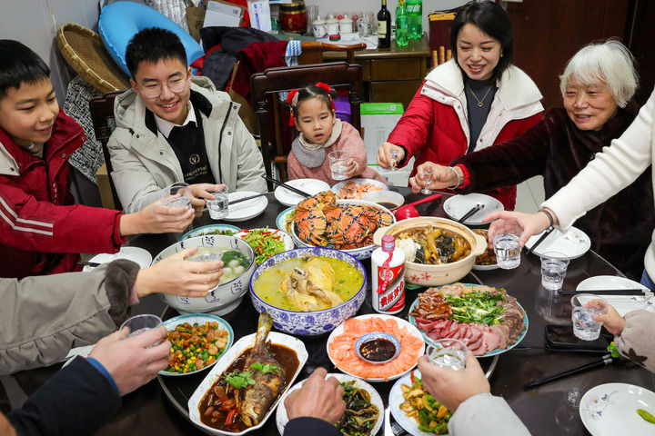 共欢新故岁,迎送一宵中。 2月16日,除夕,亿万中华儿女以不同的方式拥抱同一个主题:团圆。从万家团圆的餐桌到坚守岗位的生产一线,人们欢聚相守,在热气腾腾的年味儿里,共赴团圆之约,共话美好期许。 跨越山海,共赴团圆 皖南黟县宏村镇龙江村,年味在屋檐下油汪汪的腊肉、巷子里热闹的锣鼓声中变得愈发浓郁起来。 除夕,村民吴增荣一家人忙着去镇上采买最新鲜的食材,又张罗着贴春联,红纸黑字,墨香混着糨糊的味道,映得满院都是喜气。他说:“一家人团团圆圆心里踏实,这才叫过年。” 2月16日,人们在浙江省台州市仙居县中心菜场采买物资。新华社发(王华斌摄) 今天,所有的奔赴和抵达都锚定“团圆”这个坐标。 “哈尔滨冰雪大世界”主题高铁在林海雪原中疾驰,从上海返乡的乘客张文奇已归心似箭。“在外打拼一年,一上车看到这些熟悉的冰雪元素,心就到家了。”他接过列车长送上的吉祥物,笑意盈盈。对于像他这样跨越千里归乡的游子来说,奔赴,是春节最深情的序章。 此刻,零下十几摄氏度的黑龙江雪乡,身着大花袄的秧歌队踩着鼓点走上街头,彩扇翻飞,鼓声震天,将来自天南海北的游客卷入一场冰天雪地里的狂欢。“这年味,够劲儿!”来自深圳的游客李旭眉毛上结着白霜,脸庞却被欢腾的气氛映得通红。 从南到北,从东到西,亿万人的奔赴,汇成一个热气腾腾的中国。 纵使相隔万里,科技的暖流,让思念先于脚步抵达。“我在飞去阿根廷布宜诺斯艾利斯的飞机上,给您拜年了!”除夕当天,乘坐东航MU745航班的旅客鲁佳辰,在万米高空用Wi-Fi与亲友视频拜年、抢红包。 纵使相隔万里,一件件包裹,让年味奔向幸福的团圆。除夕清晨,雪花纷纷扬扬落进了合肥的街头巷尾,安徽顺丰芙蓉名园营业网点灯火通明。26岁的快递员张成林边分拣包裹边说:“最近几天,派件量明显上来了。往年包裹里多见衣物和日用品,如今则出现了许多生鲜特产和特色农产品,比如乳山生蚝、威海扇贝、章丘大葱。”奔跑在除夕的包裹里,既有远方的牵挂,也充满美好生活的味道。 当亿万人在奔赴中团圆,总有一群人,在奔赴中守护他人的团圆。 2月16日,在南京火车站,乘务人员在站台上回答旅客问询。新华社发(苏阳摄) 皖北平原寒风凛冽,在京沪高铁线上,国网宿州供电公司超特高压运维班班长廖志斌正在60米高的铁塔顶端,为线路“接骨”。这是他第23年参与春节保电,他说:“电通着,灯亮着,心里就踏实。” 万家灯火,年节味道 一方灶台,承载团圆滋味。煎炒烹炸的声响,是除夕最热闹的声音。 2月16日,江苏省扬州市邗江区荷叶小区内一户人家正在吃年夜饭。新华社发(齐立广摄) 重庆渝中,25岁的刘歆楠今年成为家中年夜饭“掌勺人”。一桌12个菜,既有腊肠炒蒜苗、烧白这样的经典“老几样”,也有羊肚菌酿虾滑这样的新派“漂亮饭”。传统与创新,在一方灶台上融合出不同以往的年味。 陕西西安“中华老字号”同盛祥钟楼店热闹非常,这里的除夕年夜饭被早早订满,餐馆对部分菜品做了相应调整,年夜饭口味整体偏清淡。厨师长赵磊说,这两年消费者对健康饮食和光盘行动认同更深,吃不完的年夜饭会打包带走。 团圆的餐桌,早已从以家庭为半径,画出更大的同心圆。 在上海,AI创业者韩非和社区老人、环卫工人、外卖骑手共享“马年家宴”,他用AI生成的图文菜谱作为特别礼物,为邻里添一份新意;在重庆务工的吉林人向玲,第三年组建“年夜饭搭子”群,和11名没有返乡的年轻人“拼桌过年”,分享家乡特产,他乡亦成故乡;在北京昌平霍营街道养老服务中心,志愿者们与老人们一起包饺子、话家常,养老服务中心负责人陈萌说:“家有一老,如有一宝。” 传统的年味依旧醇厚,新潮的过年方式悄然兴起。 除夕当天,首艘国产大型邮轮“爱达·魔都号”启航,将团圆宴搬到了蔚蓝的大海上。冰糖葫芦、春卷、汤圆……各地特色小吃香气四溢。“我们想把最地道、浓郁的中国味完整‘搬’到海上,让游客共度海上团圆美好时光。”爱达邮轮市场营销与电子商务助理副总裁贾璎说。 在黑龙江亚布力,滑雪场成为守岁新地标。“以前除夕是围炉包饺子,今年我们特意‘北上’寻雪。”来自浙江的游客李璐说,“在雪场守岁,这种团圆味儿更‘潮’了!” 在上海新天地,石库门的年味记忆与摩登都市的璀璨地标交相辉映,人们在“步步生花”中感受电子烟花的绚烂。“愿每一位市民游客拥有兼具仪式感与烟火气的新春体验。”瑞安新天地高级商业总监李振辉说。 从家里到邻里,从陆地到海上,从围炉到雪场——团圆的形式变了,但团圆,这个中国人心里最浪漫的情结,从未改变。 迎春启程,团结奋进 首都医科大学附属北京妇产医院的产房里,节日的喜庆和迎接新生命的喜悦交织,一个个新希望从这里诞生。 从产房外的焦灼等待,到第一声啼哭响起,北京产妇小沈许下新年心愿:“希望孩子健康快乐成长,过开心、幸福、有意义的人生。” 旧岁清零,新程启封。 这里有跃马扬鞭的朝气—— 除夕当天,云南省曲靖市马龙区新楼房村的田野间机声隆隆,铁犁翻起新土。村党总支书记赵吉飞弯腰查看犁过的土地:“赶在节前完成土地翻耕,不误农时,为年后春耕做好准备。”如今村里发展蔬菜、花卉等特色产业,2025年全村农业产值达2200万元,300户村民共享红利。“新的一年要继续带领村民们把每一块土地
