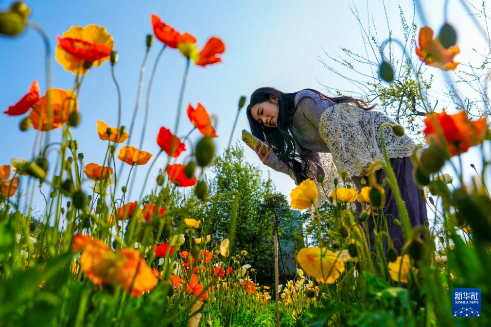 3月10日,一名游客在昆明名花谷拍摄虞美人。