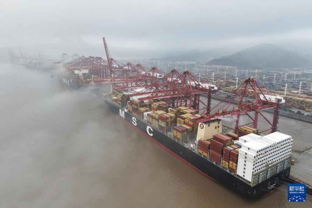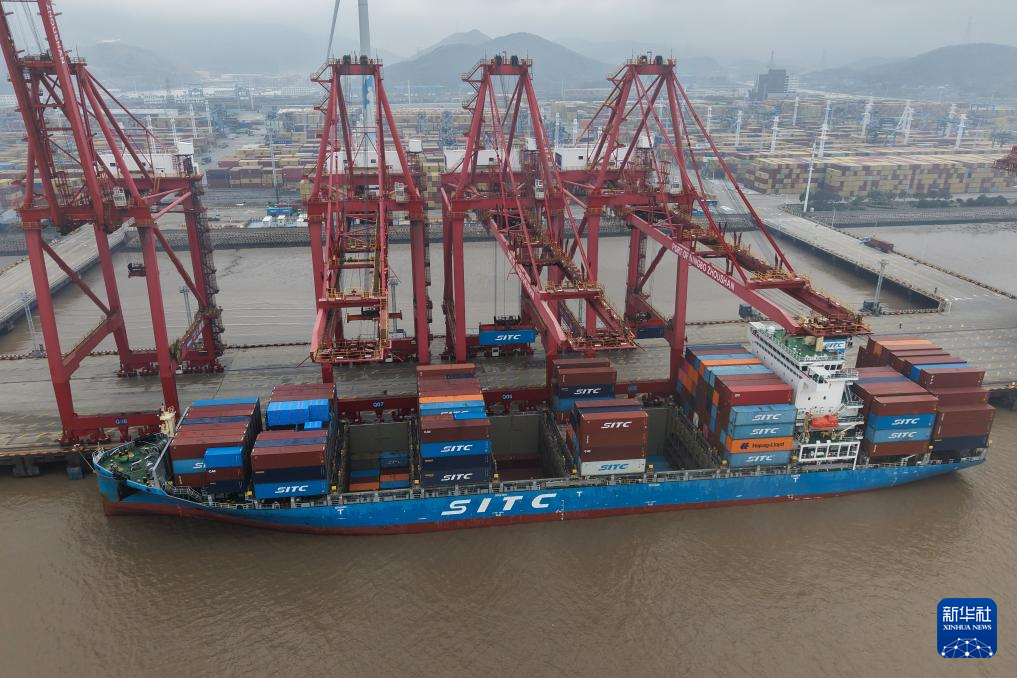 3月29日,货轮停靠在宁波舟山港穿山港区集装箱码头(无人机照片)。