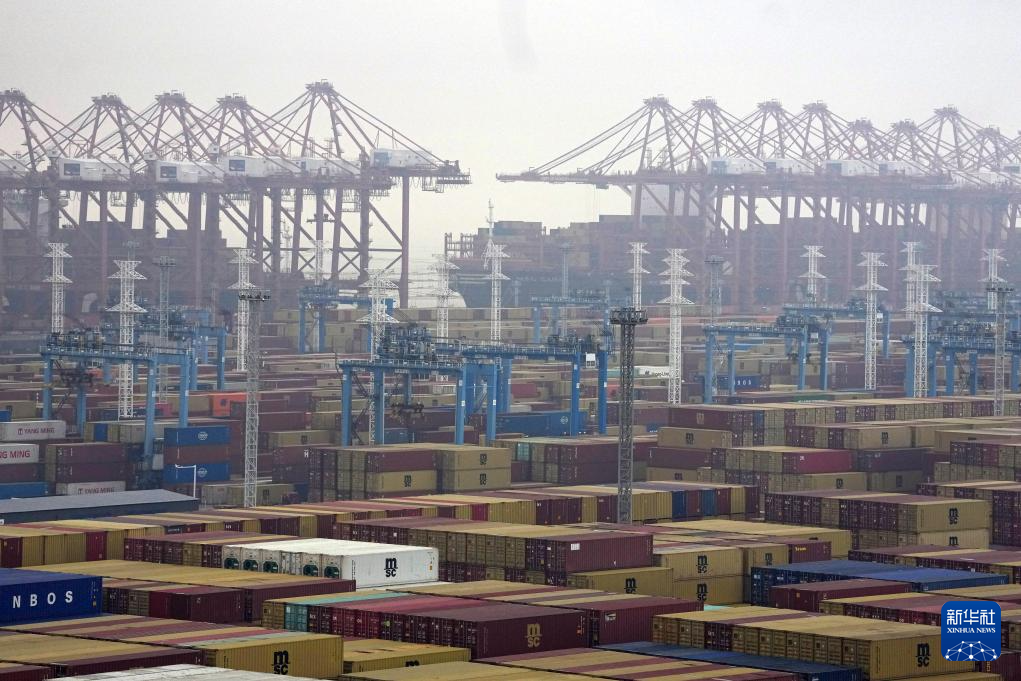3月29日,卡车在宁波舟山港穿山港区集装箱码头装卸。