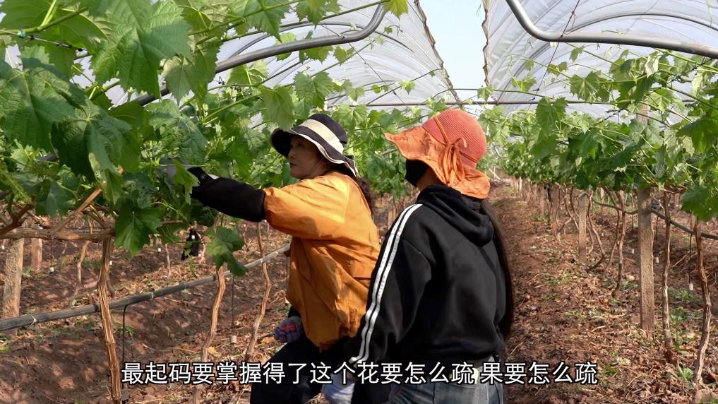 在宾川县力角镇观音阁村的葡萄田里,疏花队队长王丽美正带着队员们疏剪花穗。现在的她不仅是一名疏花疏果能手,还组建起了一支百余人的队伍。