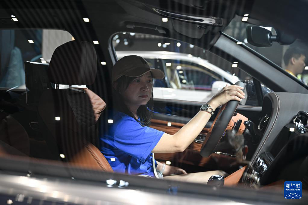 4月16日,观众在第六届消博会现场体验英国宾利汽车。