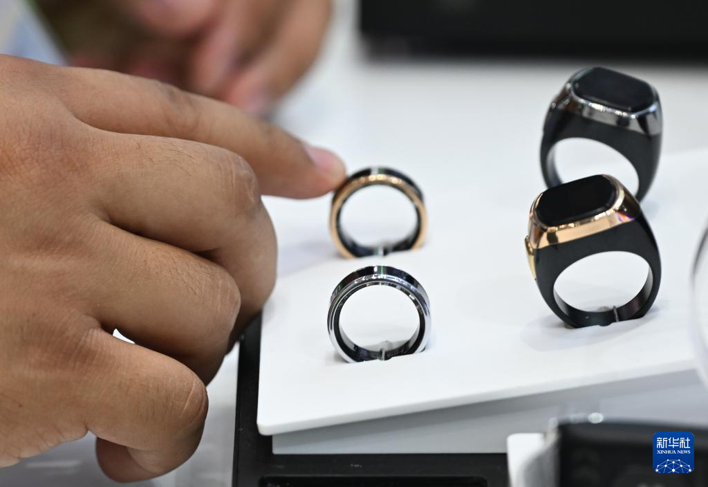4月15日,境外采购商在广交会智能穿戴展区体验智能指环产品。