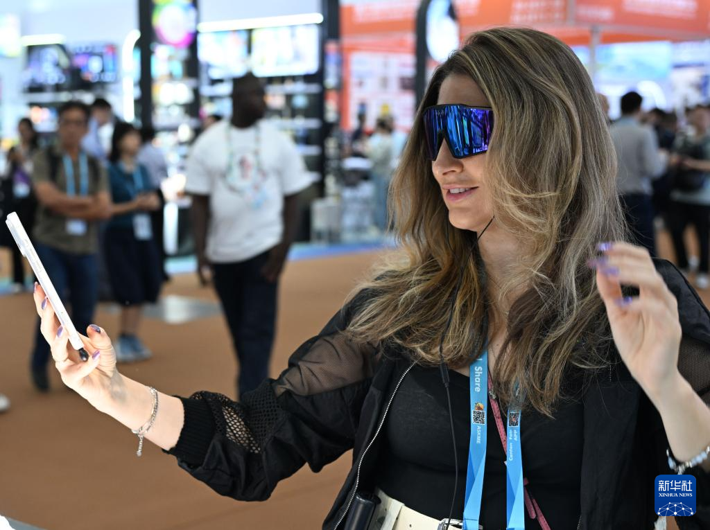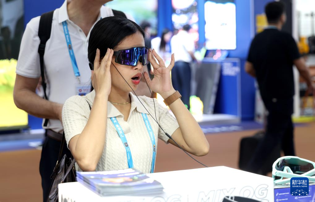 4月15日,境外采购商在广交会智能穿戴展区体验一款智能眼镜产品。